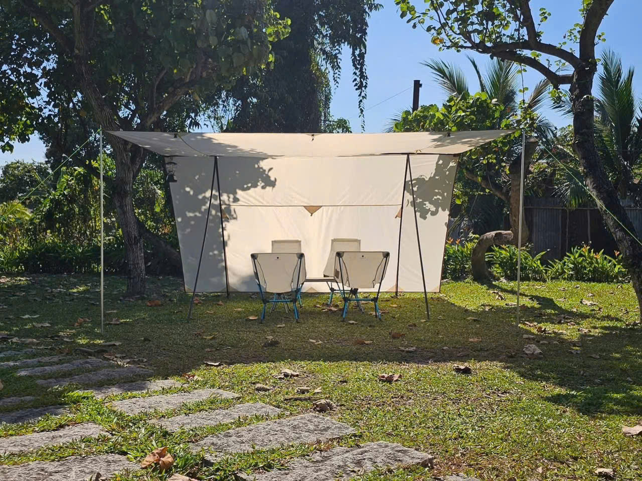 Để tùy biến cách sử dụng Anh Chị mua thêm bộ trụ chống mái với giá 300k (2 trụ + 2 cọc cắm đất + 2 dây chằng).